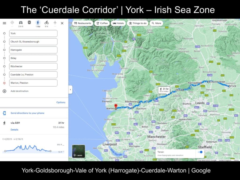Of the Insular hoards, three – Magheralagan (2+ dirhams, c.910, Co. Down); ‘County Derry’ (c.910); and Warton (3, c.925-35, Lancashire) – have an entirely Islamic numismatic element. Magheralagan and Warton were associated with hacksilver, further indicating dirhams were considered bullion. Notably, Warton is 20km due west of Cuerdale, suggesting the Ribble Valley was a routeway for dirham-using Scandinavians. The slide shows the A59 Roman road and Ribble Valley connecting Jorvik via the dirham-hoards of Harrogate (c.927-8), Goldsborough, Cuerdale and Warton, i.e., my ‘Cuerdale Corridor’ connecting Jorvik to the Irish Sea Zone.