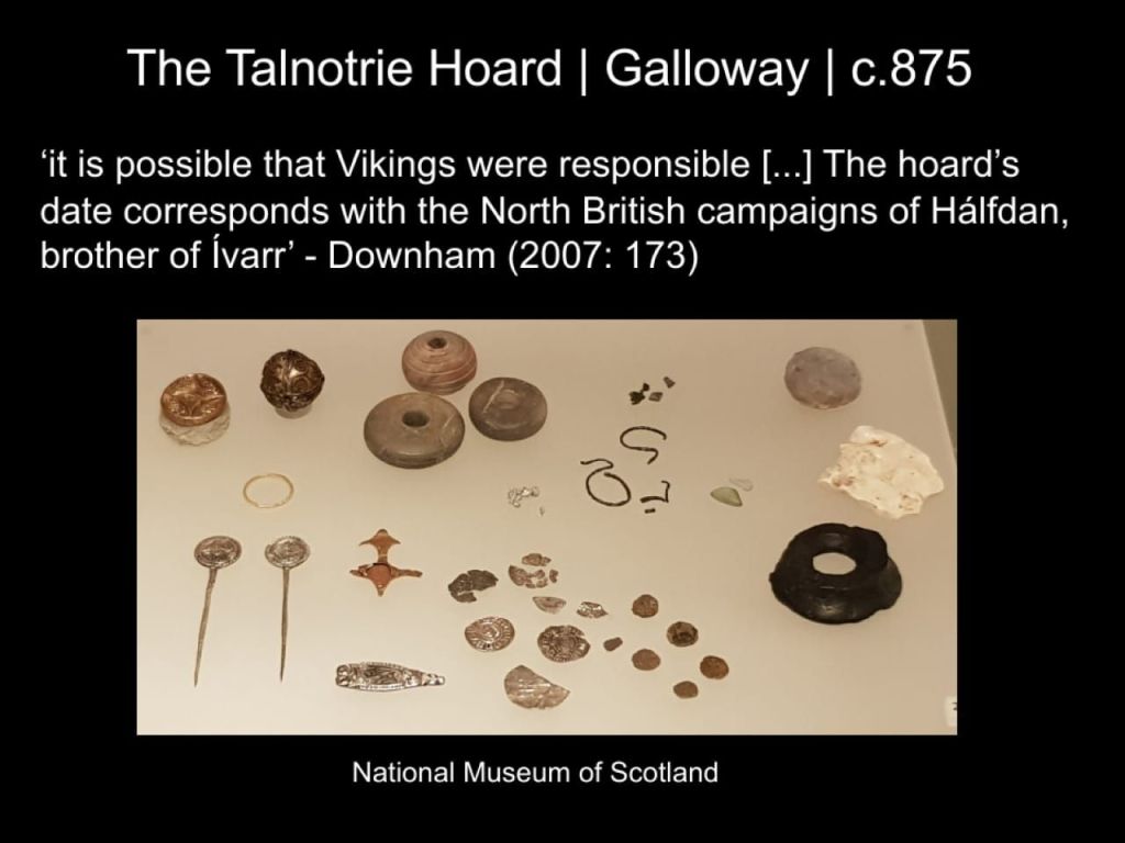 Blackburn argued dirhams ‘continued to arrive in Scotland until the mid-10th century’ on the basis of the Storr Rock and Skaill hoards. While we know too little about the single alleged dirham from the lost Machrie hoard (c.970-80, Islay), we should consider the Talnotrie hoard, with its winter-camp-like combination of decorated lead inset weight, Northumbrian stycas, Anglo-Saxon pennies, and dirhams as relating to c.874-5 Great Army activity and, therefore, the earliest dirhams in the region.
