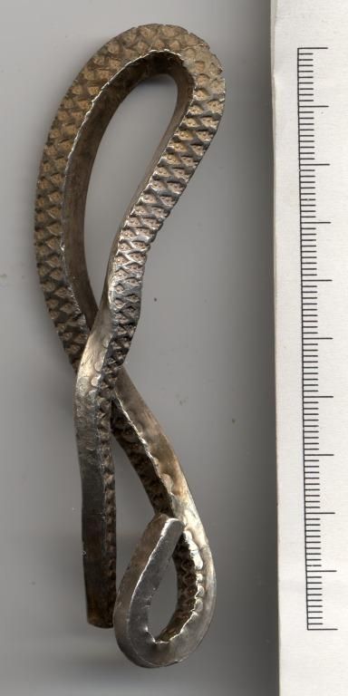From an initial inspection behind cabinet glass, I would characterize the armring fragment as possibly belonging to a group of annular examples of lozenge- or rhombus-shaped silver rod arm-rings with stamped decoration on their two outer faces.