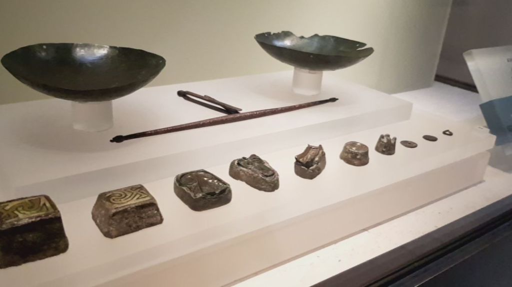 A modern replica of a Viking-Age balance can be seen in the background of the above image; such reconstructions are based on finds we have from the Viking world, including Scotland. Indeed, the following image is of the scale pans and range of bullion weights from the Kiloran Bay boat burial on the island of Colonsay. Deposited in the last quarter of the 9th century, it is now on display in the National Museum of Scotland.