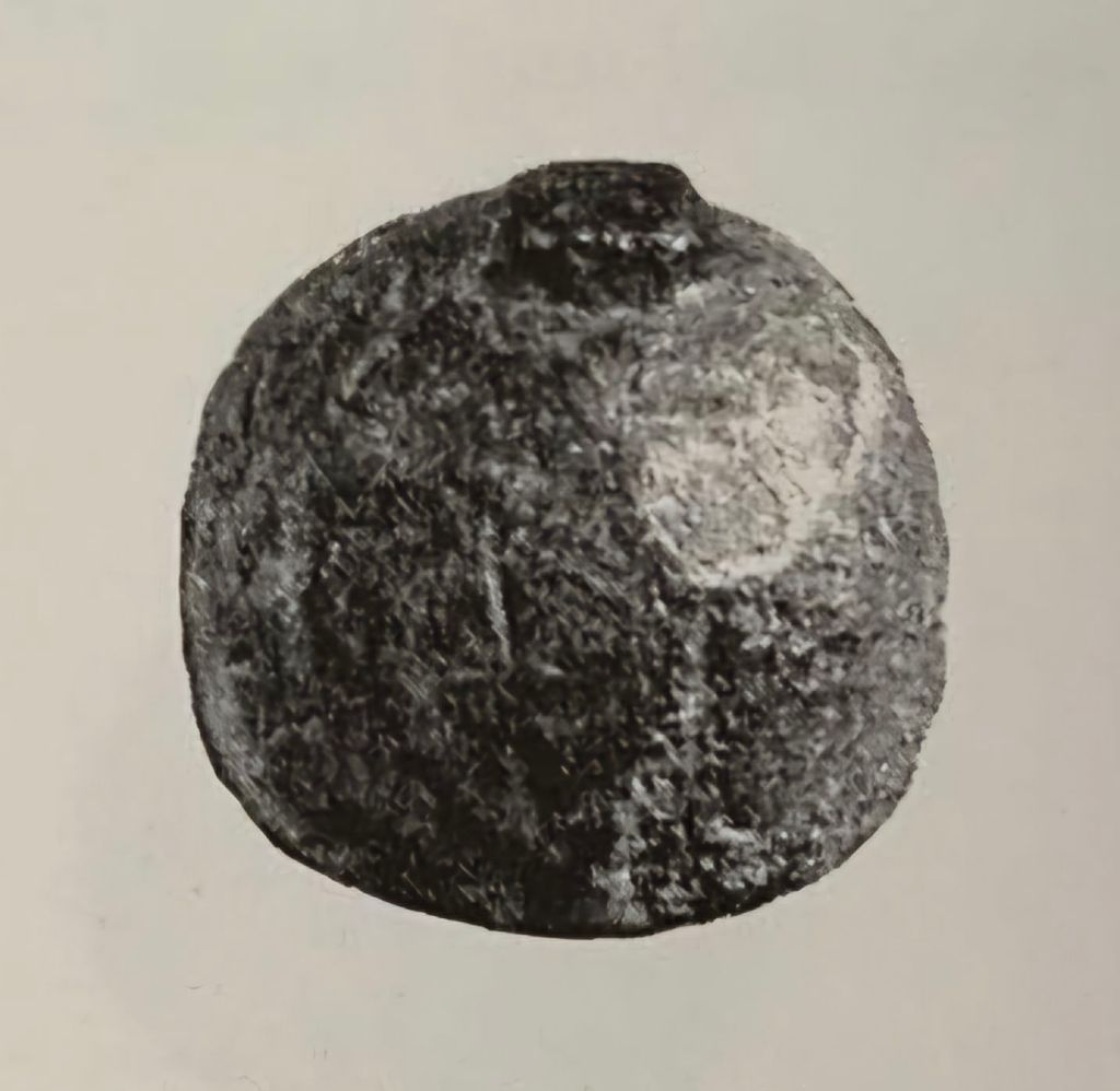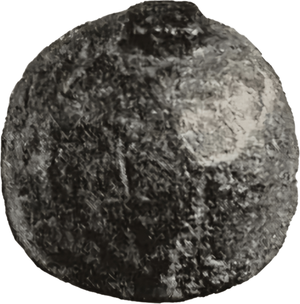 Hemispherical block, with an embedded object showing a square marked with four incuse dots. The identity of the embedded object only became apparent after several examinations. It is a small copper-alloy weight, frequently found in Viking contexts (EW, p.15).