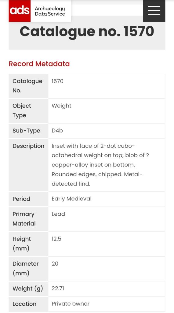 Thanks to Trix Randerson for telling me about a second of these cubo-octahedral lead-inset weights, this time from the Great Army camp known as A Riverine Site Near York / Aldwark, which you can read about in the ARSNY publication, edited by Gareth Williams (2020: 23) and in the Archaeology Data Service online catalogue (No. 1570).