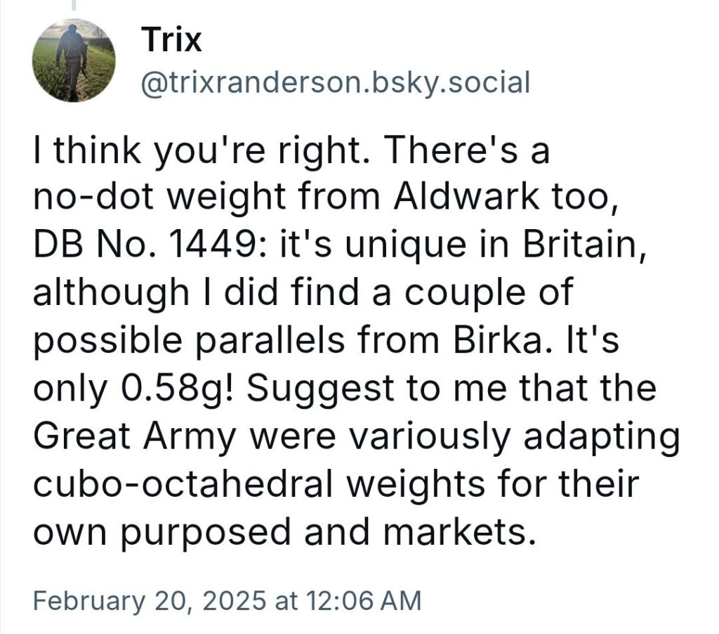 As seen below, Trix has noted a second example of this type at Aldwark, so I would say we have a new type of Viking bullion weight, one that combines eastern and western (Great Army) metrology and is, thus, a true network weight.