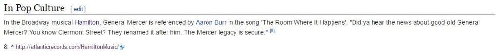Although one of the more obscure figures of the Revolution, most likely due to his death relatively early in the war, interest in Mercer has increased in recent years. Indeed, Mercer is name-checked in ‘The Room Where it Happened’, a song in Lin-Manuel Miranda’s Hamilton: An American Musical: