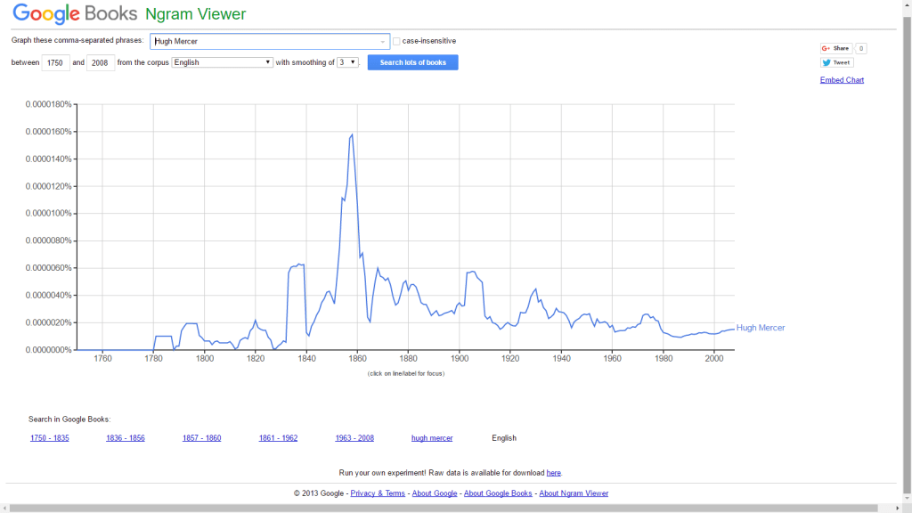 Despite more recent interest in Mercer, he is still neglected in relation to his impact; in my opinion, at least. The following screen-grab shows the mentions of ‘Hugh Mercer’ in those texts to which Google has access. The major caveat, however, is that one of Hugh Mercer’s sons was also named Hugh Mercer (1776-1853) (he features regularly in Founders Online due to his award of a paid-for education by the newly-formed United States); and a relatively prominent grandson was Hugh Weedon Mercer (1808-1877).